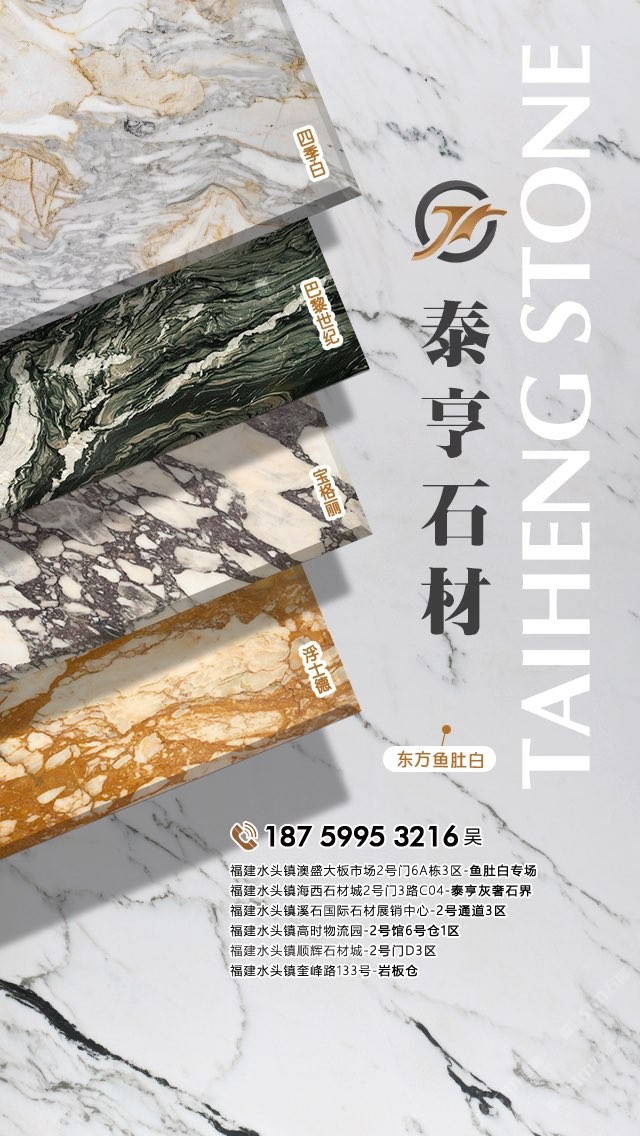 泉州泰亨石材有限公司,辦公地點位于中國石材之都—南安水頭。經(jīng)營產(chǎn)品有:東方魚肚白(自有礦山),四季白,巴黎世紀,寶格麗,浮士德,布達拉灰(自有礦山),星空灰(自有礦山)、雅蘭云天(包礦)、蘋果灰(包礦)、銀鉆咖啡(包礦)、魚肚白、雪花白、藍金沙白金沙系列、帕斯高灰、意大利木紋、意大利,西班牙原裝進口巖板(中國總代理)、國產(chǎn)巖板(福建總代理)、黃斑石、意大利木紋、銀鉆咖啡,魚肚灰等優(yōu)質(zhì)品種。我們以經(jīng)驗豐富的采購團隊,熱情專業(yè)的銷售團隊和執(zhí)著細致的技術團隊,為客戶提供精致的產(chǎn)品,售前售后服務和技術支持。本著為客戶負責的態(tài)度,經(jīng)過多年的潛心經(jīng)營,泰亨石材在石材業(yè)界樹立了良好的信譽。如果您對我司的產(chǎn)品服務有興趣,歡迎在線留言或來電來函咨詢,泰亨石材在追求美的路上與您一路同行。