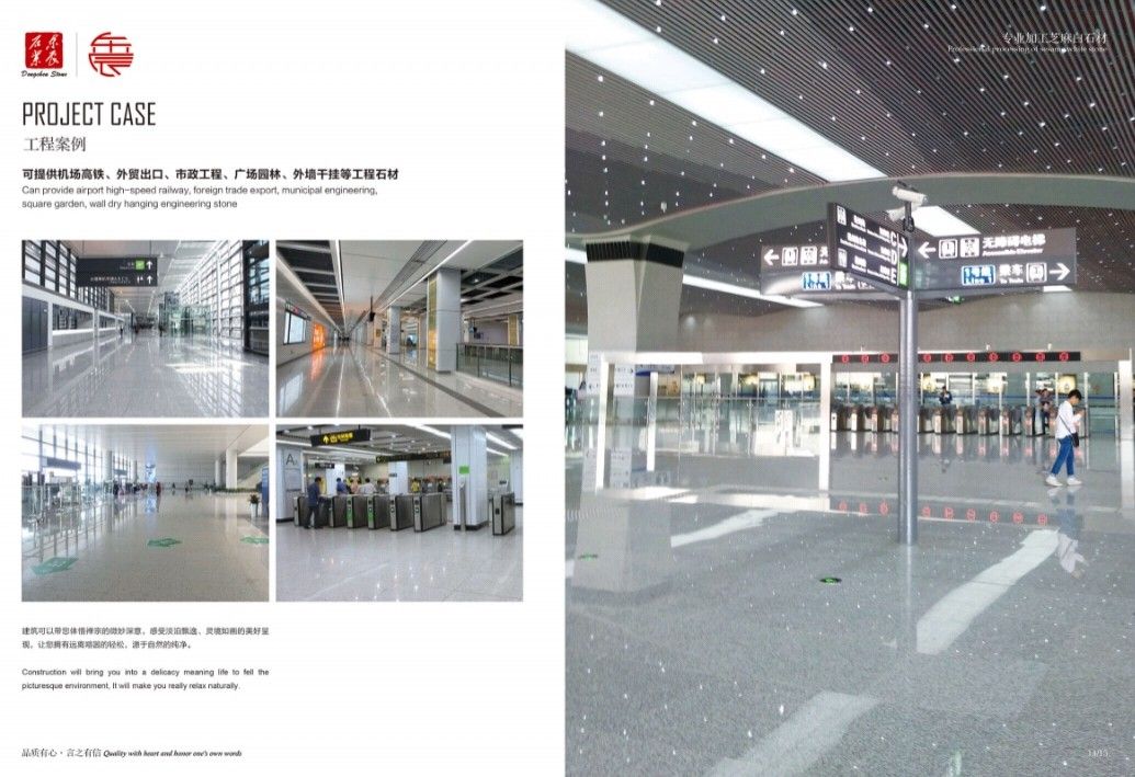 主營:承接高鐵機場、外墻干掛、廣場別墅、市政工程和外貿(mào)出口等各種工程板。 主營芝麻白G603、芙蓉白G602火燒面、光面、荔枝面、斧剁面、噴砂面、拉絲面、菠蘿面,水溝蓋板、雕刻板、路沿石、蘑菇石、擋車石、馬蹄石、冰裂紋、圓球、染色板等