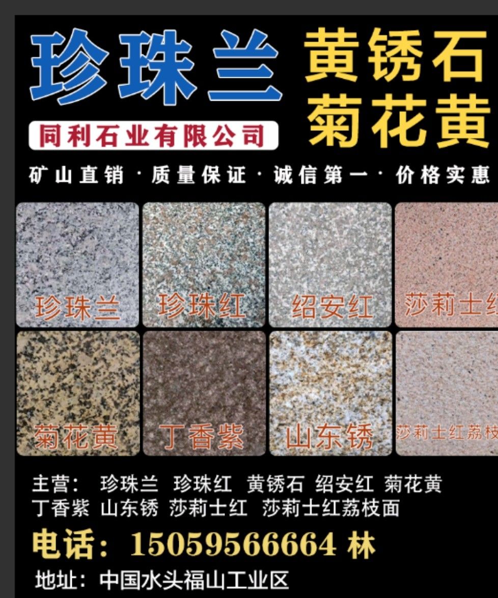 福建省同利石業(yè) 聯(lián)系人:林先生    150****6664 查看 150****6664 查看 主營范圍: 大板批發(fā)、荒料、花崗巖加工、異型加工、石材工程資質(zhì)企業(yè)、 企業(yè)地址:福建南安門市地址:福建省南安市水頭鎮(zhèn)閩南建材第一市場33幢6號(同利石業(yè))。工廠地址:山東省濟寧市汶上縣白石鎮(zhèn)白石工業(yè)區(qū)。