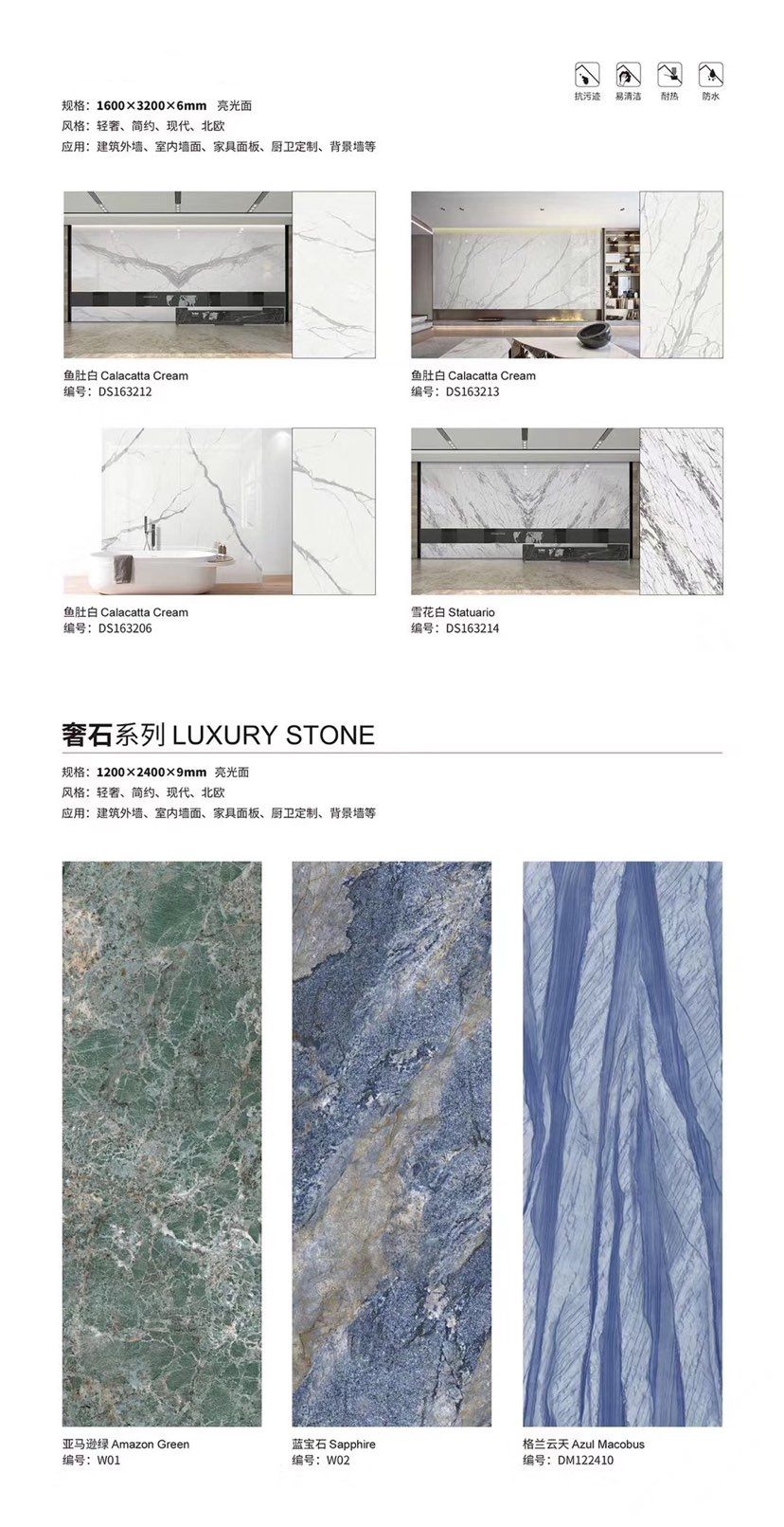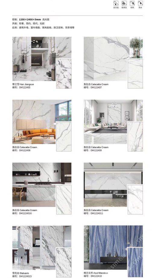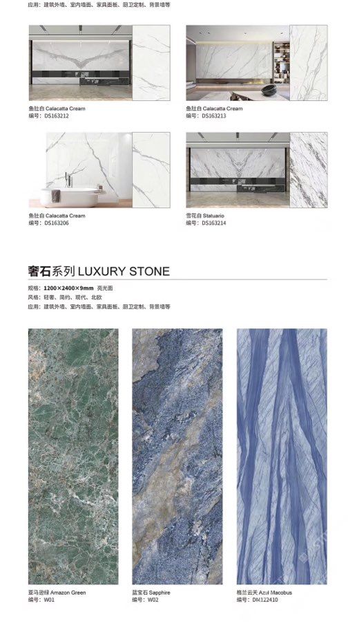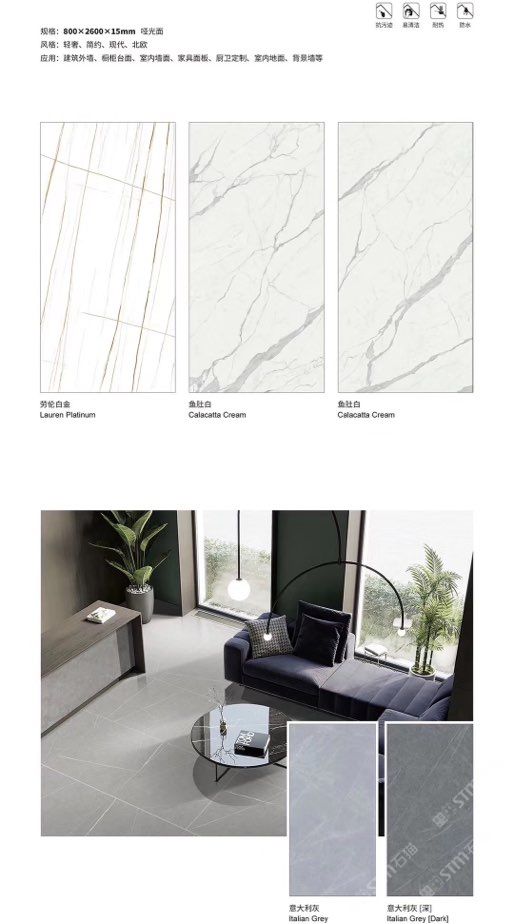 發(fā)布信息: ????SIBELAN 斯貝納巖板???? ????意大利設(shè)計師精選巖板???? 我們可以幫老總您加工為成品, 全國范圍內(nèi)可安排專業(yè)團隊安裝. 做到您一次性采購 省心. 放心. 省時. 低價! 巖板紋路版面全多達199 款 勵志做服務(wù)五星的巖板專業(yè)供應(yīng)商 魚肚白 雪花白 格蘭云天 寒江雪 爵士白 幻影灰 勞倫黑金 火山灰 亞馬遜 艾維拉 羅馬黑檀 貝特巖 細花白 羅馬灰 云朵拉灰 魚肚金 莎羅娜 莎羅蘭 勞倫白金 拉薩白 中花白 灰冰玉 卡拉拉白 撒金黑 清水玉 薩瓦灰 莎士比亞 大花灰 白冰玉 銀灰洞 阿瑪尼灰 綠紋玉 綠冰玉 藍紋玉 保加利亞灰 鐵銹 黑木紋 流砂灰 純白 純灰 純黑 TEL: 15905069590 聶 各種版面規(guī)格全部如下: 1200×600×11mm 啞光 1500×800×11mm 啞光 1800×900×11mm 啞光 1800×900×12mm 啞光 2600×800×15mm 啞光 2400×1200×6mm 啞光/亮光 2400×1200×9mm 啞光/亮光 2400×1200×15mm 啞光 2700×1200×6mm 啞光/亮光 2700×1600×12mm 啞光/亮光 3200×1600×6mm 啞光/亮光 3200×1600×12mm 啞光/亮光