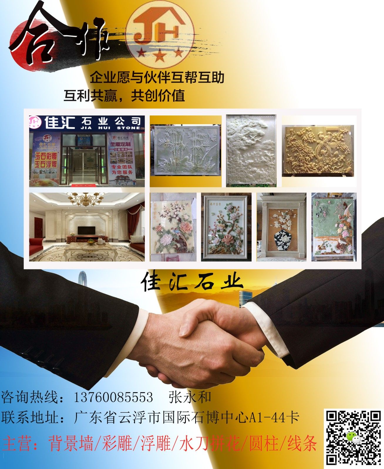 佳匯石業(yè) 聯(lián)系人:張永和    137****5553 查看 手機號碼:無 主營范圍: 異型加工、石材工藝品、石材雕刻、水刀拼花、 企業(yè)地址:廣東云浮云浮石材博覽中心A1-44卡