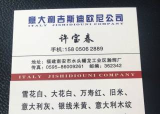 意大利石業(yè)主營(yíng)產(chǎn)品:雪花白,雪花白3,魚(yú)肚白,魚(yú)肚白(崗石),意大利灰31,大花白(大理石),銀線米黃,意大利黑金花,舊米黃,萬(wàn)壽紅,帝諾米黃(直紋)企業(yè)地址:福建泉州南安市水頭鎮(zhèn)蟠龍瀚輝廠