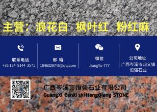 廣西岑溪市恒強(qiáng)石業(yè)主營(yíng)產(chǎn)品:海浪花(浪花白),浪花白1,浪花白(海浪花),浪花白,楓葉紅(荔枝面),楓葉紅(菠蘿面),楓葉紅(斧剁面),楓葉紅(火燒面),楓葉紅,粉紅麻2企業(yè)地址:廣西岑溪?dú)w義鎮(zhèn)恒強(qiáng)石業(yè)